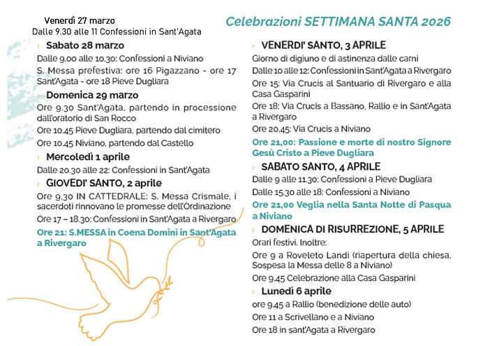 Alternando le tre chiese, ogni domenica Celebrazione della Santa Messa alle ore 10:00. Dal mese di ottobre al Sabato delle Palme non si terranno celebrazioni.